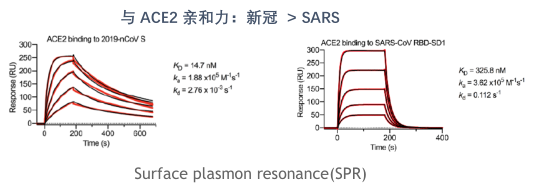 隨后,作者又分別分析了兩個病毒S蛋白與ACE2的親和力,新冠病毒S蛋白與ACE2的KD(平衡解離常數(shù))是14.7nM,SARS病毒S蛋白與ACE2的KD是324.8nM,KD越高,親和力越低,暗示著新冠病毒的傳染性要高于SARS病毒。