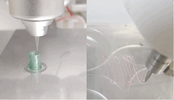 低黏度材料(如海藻酸鈉)的打印往往困難重重,對于這類材料,交聯(lián)固化的時機尤其重要:提前固化會導致打印噴頭的堵塞;后期固化會導致結構體精度較差。所以亟需一項可以對低黏度材料進行原位固化的技術。