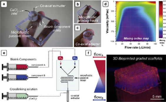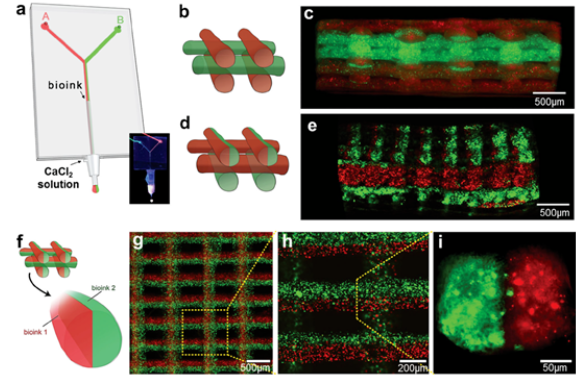 目前,已經(jīng)有研究者實現(xiàn)具有多層次套管組織的打印,多材料的復合使用是同軸噴頭技術的下一步方向。UCLA的AliKhademhosseini教授團隊,就使用同軸噴頭打印了含有多層細胞套管的管腔結構。