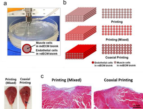 由于同軸噴頭可以輕松地實現(xiàn)管腔結構的打印,所以在構建組織的血管化方面又有了新的突破。