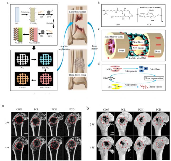 上海交通大學醫(yī)學院的鄧廉夫教授團隊于Biomaterials發(fā)表文章,通過高溫熔融打印技術構建了負載去鐵胺(DFO)的PCL骨修復支架。體內外研究表明構建的生物3D打印支架具有優(yōu)異的血管化和成骨活性,能夠快速的促進大鼠股骨遠端巨大骨缺損的修復。同時,該研究設計通過靶向調控HIF-1α信號通路,實現了3D打印支架能夠模擬并促進生理狀態(tài)下骨修復重建過程中血管化的關鍵步驟,為功能化3D打印支架的構建提供了新的思路和轉化前景。