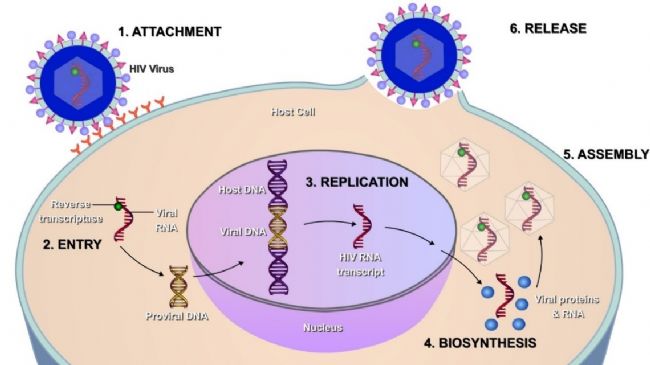 病毒是一種個(gè)體微小、結(jié)構(gòu)簡單、只含一種核酸(DNA或RNA)、必須在活細(xì)胞內(nèi)寄生并以復(fù)制方式增殖的非細(xì)胞型生物。而病毒侵染宿主細(xì)胞卻是一個(gè)非常復(fù)雜的過程,主要分為吸附(Attachment)、進(jìn)入(Entry/Penetration)、復(fù)制(Replication)、大分子合成(Biosynthesis)、裝配(Assembly)、釋放(Release)等幾個(gè)階段,如圖1。