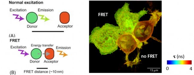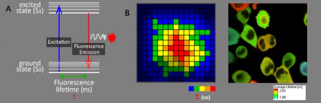 圖2. A. 熒光壽命示意圖;B. FLIM:提供每個(gè)像素位點(diǎn)的熒光壽命信息(左);基于熒光壽命信息的細(xì)胞成像結(jié)果(右)