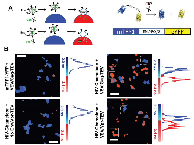 A.(左)TEV蛋白酶(TEVp)與HIV-1 Vpr蛋白或Gag蛋白融合的兩種包裝過程;(右)HIV-Chameleon生物傳感器示意圖;B.病毒融合前后的熒光壽命成像(Scale Bar=30μm)