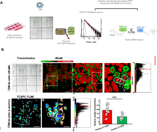 (二)細(xì)胞代謝水平對于HIV-1侵染宿主細(xì)胞的影響[4]研究人員在HIV-1病毒的侵染機(jī)制研究中發(fā)現(xiàn),病毒侵染過程中,宿主細(xì)胞代謝水平與膜狀態(tài)改變有關(guān)。將FRET生物傳感器瞬時(shí)轉(zhuǎn)染到細(xì)胞中(如圖5A),記錄瞬時(shí)表達(dá)這些生物傳感器的細(xì)胞的FLIM圖像,并進(jìn)行BlaM分析,結(jié)果表明,乳酸濃度較高的單細(xì)胞與病毒融合性更高,此外,具有更高ATP/ADP比率的細(xì)胞與病毒的融合性更高(如圖5B)。也就是說,糖酵解通量較高的細(xì)胞更容易被HIV-1感染。