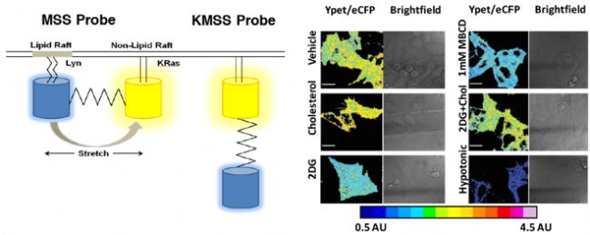 圖6.(左)靈敏型膜張力感應(yīng)器MSS探針以及對照組非靈敏型感應(yīng)器KMSS探針示意圖;(右)多種不同處理?xiàng)l件下,TZM-bl 細(xì)胞表達(dá)MSS的FRET效率成像
