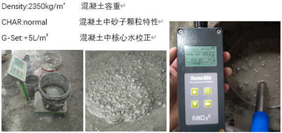 2330kg/dm3,使用SONO-WZ新拌混凝土水分快速測(cè)量?jī)x,以70-90°的角度將探頭沿著桶壁插入混凝土中,點(diǎn)擊測(cè)量,讀取結(jié)果。