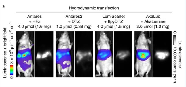 以熒光素酶作為體內(nèi)報告源的生物發(fā)光方法,特異性極強。由于動物本身沒有任何自發(fā)光,生物發(fā)光具有極低的背景和極高的信噪比。