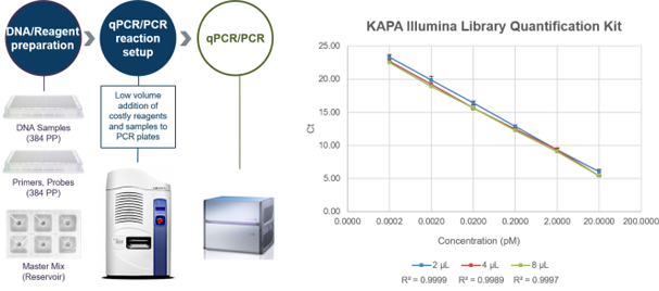 Echo可完成384孔甚至1536孔每板的超高通量微量化文庫質(zhì)控定量。聲波移液含DNA染料的緩沖溶液、文庫到酶標板中進行熒光檢測;蚴沁M行文庫qPCR檢測體系構(gòu)建,避免標準品梯度稀釋的累積誤差和氣溶膠污染。文庫定量的微量化能夠減少試劑消耗,有效控制成本。此外,Echo支持在軟件中以表單的形式挑選某些文庫做qPCR。整個實驗過程數(shù)據(jù)可循,避免手工操作的竄孔等錯誤。