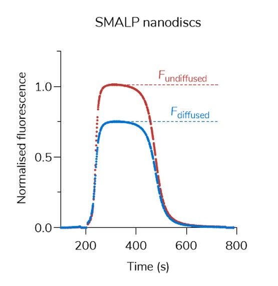Fluidity one-W利用MDS技術(shù),直接在溶液中檢測分子結(jié)合事件,是一種通過微量樣品檢測SMALP納米盤形成的理想工具。SMALP納米盤的平均流體動力學半徑根據(jù)SMA/脂質(zhì)比例不同從20 nm到4.5 nm不等。這種大小的變化將顯著改變?nèi)魏吻度氲鞍字車闹|(zhì)環(huán)境,因此在納米盤研究中至關(guān)重要。
