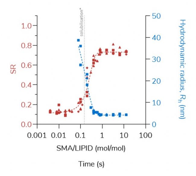 在本應(yīng)用中采用MDS技術(shù)的Fluidity one-W檢測到了SMALP納米盤的形成,而且揭示了SMA與脂質(zhì)體的比例是如何影響SMALP納米盤的大小,這是表征嵌入膜蛋白的一個關(guān)鍵參數(shù)。