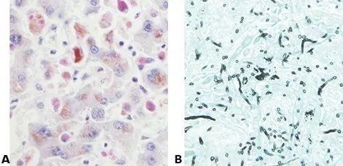 B.銀 Gomer i染色方法染肺部真菌(曲霉屬)感染。大多數(shù)城市居民和吸煙者肺中的一個(gè)共同特征,即真菌的菌絲在非染色情況下都是黑色的。