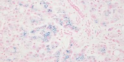 使用Perl’s方法證明肝硬化含鐵血黃素(藍(lán)色)包含鐵。這是一個(gè)較好的鐵陽(yáng)性對(duì)照染色。