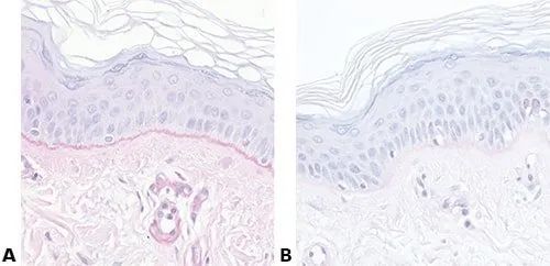 這兩張皮膚玻片來(lái)自同一塊蠟塊,同樣使用PAS染色。A玻片酸處理(氧化步驟)為5分鐘,而B(niǎo)玻片只有30秒(錯(cuò)誤)。結(jié)果B玻片基底膜染色效果很差。