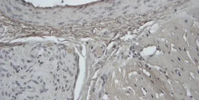 Weigert’s 蘇木素由于過(guò)氧化呈現(xiàn)不干凈的染色效果,請(qǐng)注意膠原的棕色染色。