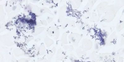 使用長(zhǎng)了微生物的染色溶液(蘇木素)對(duì)玻片進(jìn)行染色,可見(jiàn)大量外來(lái)微生物覆蓋在組織切片頂部。