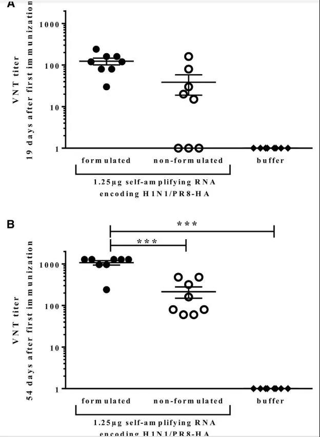 目前為止的研究表明:兩種疫苗類型均可誘導(dǎo)免疫反應(yīng),但并未明確哪種方法是最佳的。因此,本研究比較了一下合成mRNA和sa-RNA表達的流感病病毒血凝素。發(fā)現(xiàn)兩種RNA都有保護性。但同等的保護水平,sa-RNA 僅需要1.25 mg,而mRNA 需要80 mg,足足節(jié)省了64倍的原料。確定sa-RNA比mRNA更有效后,又以sa-RNA作為疫苗測試了三株流感病毒,分別為H1N1,H3N2(X31)和B(馬薩諸塞州)毒株,并且發(fā)現(xiàn)sa-RNA都能保護目標免受感染。當(dāng)sa-RNA制成三價制劑,可以防止H1N1和H3N2病毒侵染。由此我們得出結(jié)論:sa-RNA更具美好前景的抗病毒疫苗。