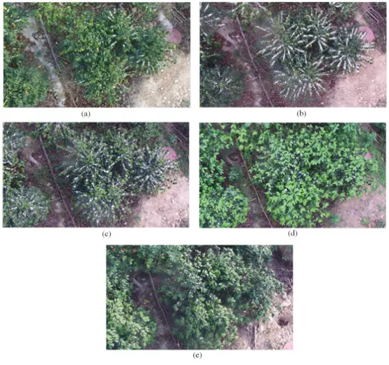 Figure1: The five flowering events. (a–e) represent the images acquired on March 7th,March 25th, April 11th, April 27th, and May 25th,2017, respectively.