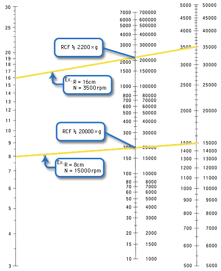 上圖轉(zhuǎn)速與半徑相對應的離心力列線圖,左列為半徑標尺,右列為轉(zhuǎn)速標尺,連接半徑與轉(zhuǎn)速的直線與中間RCF 表尺的交匯點,就可得到相對離心力。注意,若已知的轉(zhuǎn)數(shù)值處于rpm 標尺的右邊,則應讀取RCF 標尺右邊的數(shù)值,轉(zhuǎn)數(shù)值處于rpm 標尺左邊,則應讀取RCF 標尺左邊的數(shù)值。