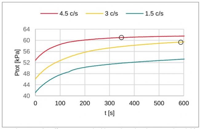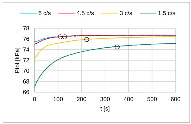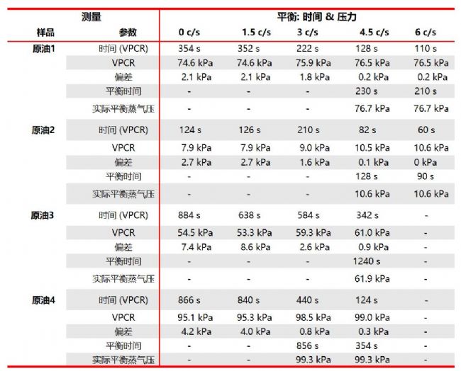 四種原油在4.5c/s(或更高)的振蕩速率下,蒸汽壓力最終不再變化。在這一點上可以證明蒸汽壓達到了熱力學平衡。因此,可將4.5 c/s的振動頻率視為臨界閾值。當使用較慢的振蕩速率時,在合理的測量時間內無法觀察到熱力學蒸氣壓平衡的形成。另一方面,使用高于4.5 c/s的振蕩速率時不會再改變最終的VPCR結果,即使達到最終壓力水平的速度會稍快一些。