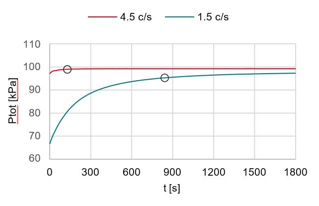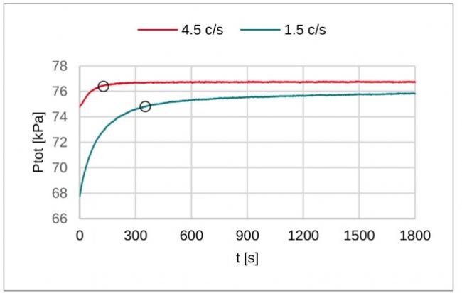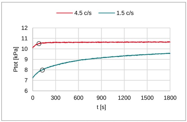 在1.5 c/s的最小振蕩速率下,即使達到GB/T 11059的穩(wěn)定性標準,壓力仍會顯著升高。這導致VPCR結果與平衡蒸氣壓之間存在較大差異。當最小搖動速度為1.5c/s時,VPCR與實際平衡蒸氣壓結果(1800 s,振蕩速率為4.5c/s時的壓力)之間的偏差可高達8.6kpa。對于4.5 c/s的振蕩速率,該偏差明顯較小,這意味著這些測量的精度更高。