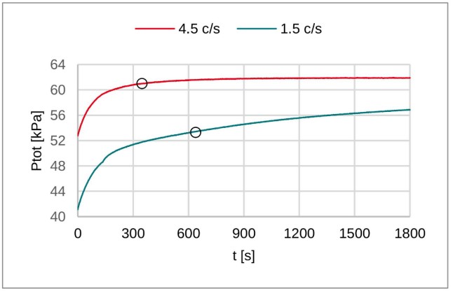 圖6:原油3的測量:氣液比為4:1,振蕩速率介于1.5 c/s到4.5 c/s之間,時間1800秒。平衡點為圓形標記。