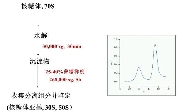 速率區(qū)帶離心經典的應用就是通過蔗糖密度梯度離心,進行各種亞細胞器(核糖體、線粒體、Exosome 等)和病毒顆粒(病毒載體、疫苗等)的純化。例如,我們在上一期中得到的 70S 核糖體沉淀,經過水解后,可利用蔗糖密度梯度離心,進一步分離純化得到 50S 和 30S 的兩個亞基。具體的實驗流程如下:
