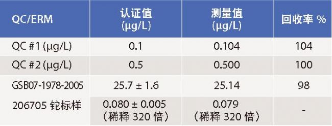 我們通過質量控制(QC)檢查——校準標樣之后立即分析質控樣品——和分析環(huán)境參考標準物質(ERM)來確保該方法的有效性。QC標準樣品能保證良好的回收率,變動范圍不超過10%,可以滿足監(jiān)管機構通常的要求。