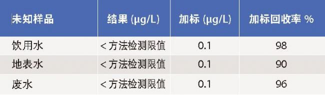 我們分析了三種不同的水樣品。結果表明所有樣品中的鉈含量都低于方法檢測限值。添加0.1μg/L鉈之后,每份樣品的回收率范圍是90-98%,表明富集過程沒有導致樣品損失,而且說明該方法的準確性很高。