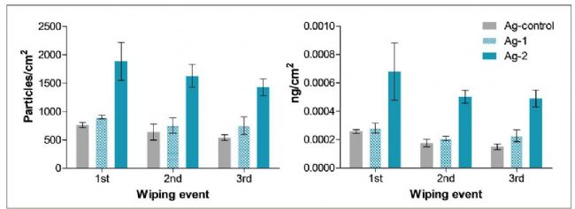 圖1.用抹布擦拭時鍵盤膜上的銀納米微粒遷移情況。左邊:每平方厘米遷移的微粒數(shù)量。右邊:質(zhì)量遷移,單位:納克/平方厘米。誤差線表示三個樣本的平均值標(biāo)準(zhǔn)誤差。“銀對照樣本”指不含銀納米微粒的鍵盤膜。