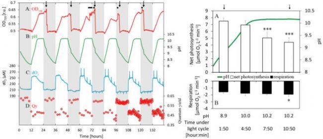 捷克科學(xué)研究院、悉尼大學(xué)、匈牙利科學(xué)研究院和鄧迪大學(xué)的研究者,使用FMT150研究碳脅迫對微擬球藻的影響[1],通過FMT150設(shè)定光強(qiáng)、光周期和溫度等環(huán)境條件,即時(shí)同步測量OD720、PH、DO2和QY變化,實(shí)時(shí)監(jiān)測藻類生長動(dòng)態(tài)。