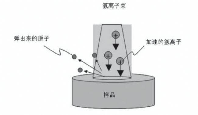 離子研磨實(shí)現(xiàn)的過程中,首先通過一個(gè)高壓電極來(lái)對(duì)氬氣進(jìn)行電離,從而形成氬離子;繼而再通過一個(gè)高壓電場(chǎng)來(lái)對(duì)氬離子實(shí)施加速,經(jīng)過帶有偏轉(zhuǎn)電場(chǎng)的離子槍頭,使其形成離子束對(duì)需要研磨的樣品進(jìn)行轟擊,將樣品表面物質(zhì)以原子的形態(tài)清除出去,以使得樣品達(dá)到無(wú)應(yīng)力研磨的效果。如圖 1 所示。在整個(gè)過程中會(huì)調(diào)整一些參數(shù),例如離子能量,離子束入射角,以優(yōu)化樣品制備時(shí)間和表面質(zhì)量。