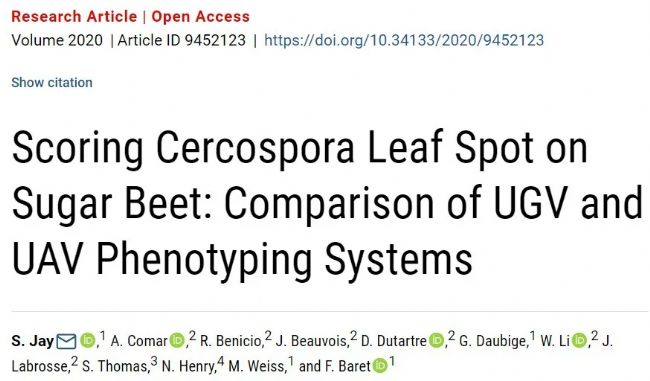 近日,Plant Phenomics在線發(fā)表了法國國家農(nóng)業(yè)食品與環(huán)境研究院(French National Institute for Agriculture, Food, and Environment (INRAE)) Sylvain Jay等人的題為Scoring Cercospora Leaf Spot on Sugar Beet: Comparison of UGV and UAV Phenotyping Systems的研究論文。