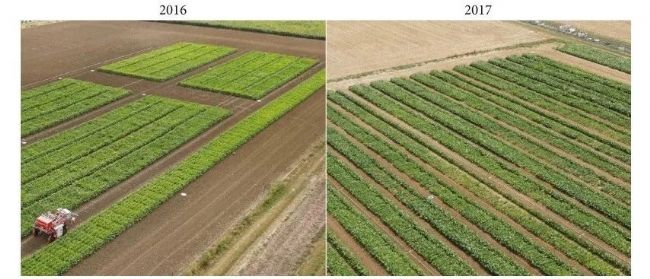 Fig.1 Microplot experiments as observed from the UAV and conducted in 2016.