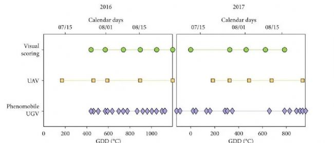 Fig.2 Sampling dates for visual scoring (green circles), UAV (orange squares), and Phenomobile UGV (purple diamonds) measurements, for 2016 (left) and 2017 (right).