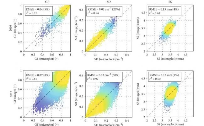 Fig.5 Variability of Phenomobile-derived GF (left), SD (middle), and SS (right) per image (y-axis) versus their averages per microplot (x-axis).