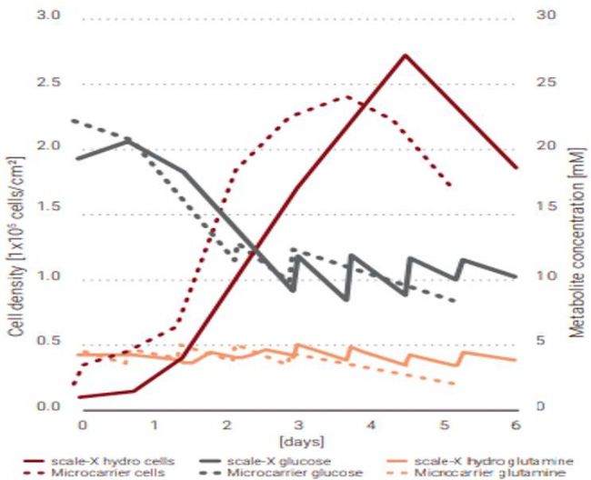 圖4: scale-X™ hydro生物反應(yīng)器和標(biāo)準(zhǔn)微載體培養(yǎng)中的Vero細(xì)胞生長(zhǎng)