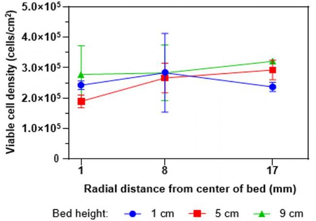 scale-X™ hydro固定床生物反應(yīng)器可生產(chǎn)與微載體運(yùn)行相似的感染性滴度,但達(dá)到的生產(chǎn)時(shí)間更短。此外,固定床生物反應(yīng)器生產(chǎn)rVSV-ZEBOV的病毒基因組和感染性滴度比例更低,而感染性病毒顆粒的細(xì)胞特異性產(chǎn)率更高?傮w結(jié)果顯示,當(dāng)工藝轉(zhuǎn)移至固定床scale-X™生物反應(yīng)器時(shí),可獲得相似的細(xì)胞生長(zhǎng)趨勢(shì)和最高單位面積細(xì)胞濃度。最后,對(duì)Vero細(xì)胞生長(zhǎng)分布的研究顯示,固定床內(nèi)有均勻的細(xì)胞貼附和生長(zhǎng)。相比微載體工藝,固定床的緊湊設(shè)計(jì)可使設(shè)備占地降低5倍。