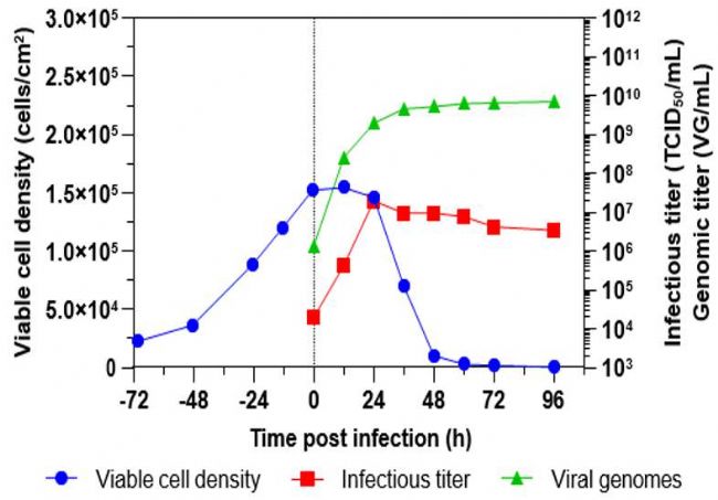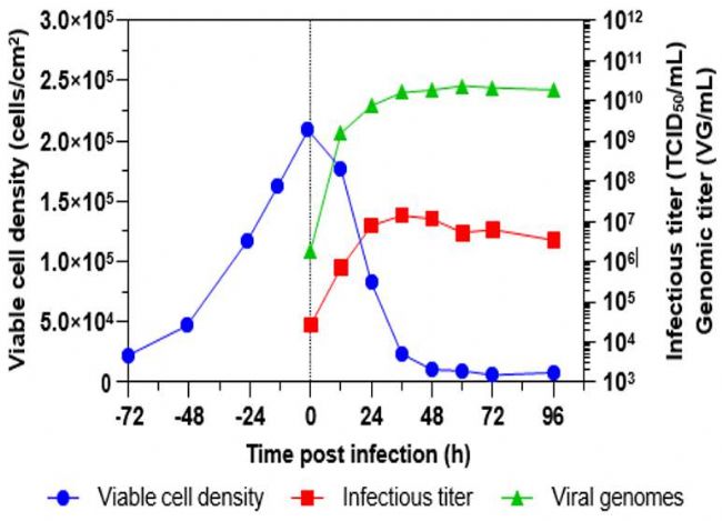 2 ) ,生物工藝以相同的方式進(jìn)行,工藝參數(shù)維持為相同的設(shè)定點(diǎn)。在相同的3天細(xì)胞培養(yǎng)時(shí)間后,以MOI 0.01,感染rVSV-ZEBOV。