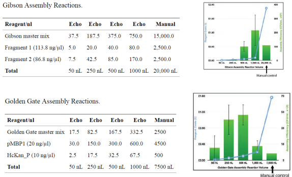 使用Echo進(jìn)行微量化DNA組裝,可以在構(gòu)建更低的情況下獲得更高的轉(zhuǎn)化效率。在Gibson組裝中,反應(yīng)體系500nL和1000nL時(shí)轉(zhuǎn)化效率不差于手工操作20uL,反應(yīng)體系降低40倍;在Golden Gate組裝中,表現(xiàn)更優(yōu)秀,反應(yīng)體系低至50nL時(shí)轉(zhuǎn)化效率就不差于手動操作7.5uL,反應(yīng)體系可降低150倍。