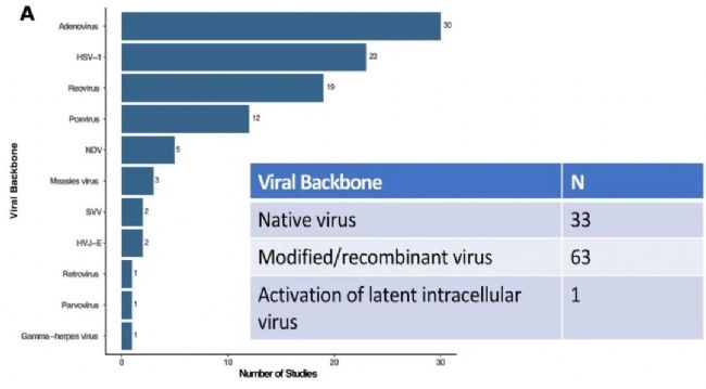 使用最多的是腺病毒(Adenoviruses),其次為單純皰疹病毒HSV-1(唯一獲批的溶瘤病毒產(chǎn)品,Amgen T-VEC使用此病毒),呼腸孤病毒(Reoviruses)和痘類病毒(Poxviruses:)分列3,4位,其余使用較少。
