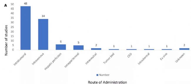 一半選擇瘤內(nèi)注射的方法,避開腫瘤屏障的阻礙及機(jī)體免疫系統(tǒng)的清除作用。約三分之一選擇了靜脈注射的方法。其他方法使用較少。臨床結(jié)果也顯示,瘤內(nèi)注射臨床響應(yīng)率最高。