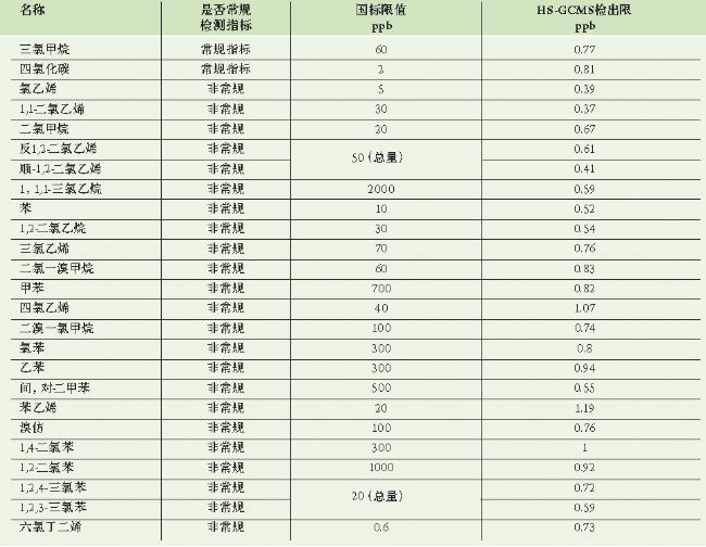 國(guó)標(biāo)生活飲用水衛(wèi)生標(biāo)準(zhǔn)(GB 5749-2006)中規(guī)定了水質(zhì)檢測(cè)指標(biāo)共106項(xiàng)。其中揮發(fā)性有機(jī)化合物指標(biāo)一部分使用頂空進(jìn)樣方式運(yùn)行樣品,另一部分使用傳統(tǒng)的萃取方式提取待測(cè)組分實(shí)現(xiàn)樣品檢測(cè)。萃取提取的檢測(cè)結(jié)果存在較大人為因素,又費(fèi)時(shí)費(fèi)力。因此,如何簡(jiǎn)化實(shí)驗(yàn)過(guò)程,同時(shí)保證檢測(cè)靈敏度是諸多檢測(cè)部門需要解決的問(wèn)題。