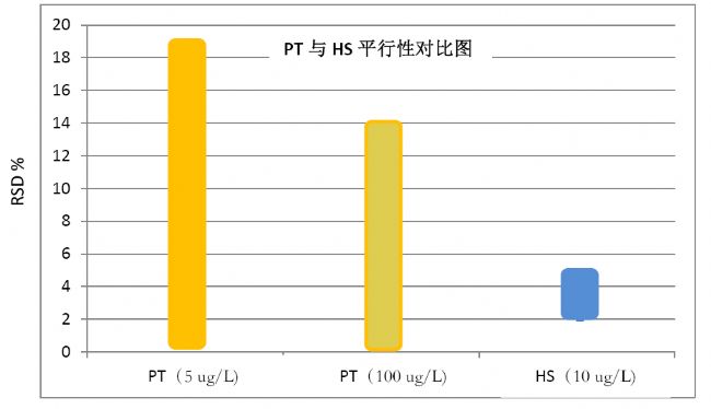 來(lái)自相同濃度標(biāo)準(zhǔn)品六次進(jìn)樣結(jié)果的相對(duì)標(biāo)準(zhǔn)偏差。PT結(jié)果的相對(duì)標(biāo)準(zhǔn)偏差為0.4-19%(5ug/L)或0.2–14%(100ug/L),HS為2-5%(10ug/L),均滿足國(guó)標(biāo)規(guī)定的相對(duì)標(biāo)準(zhǔn)偏差小于20%的要求,且HS結(jié)果好于PT。