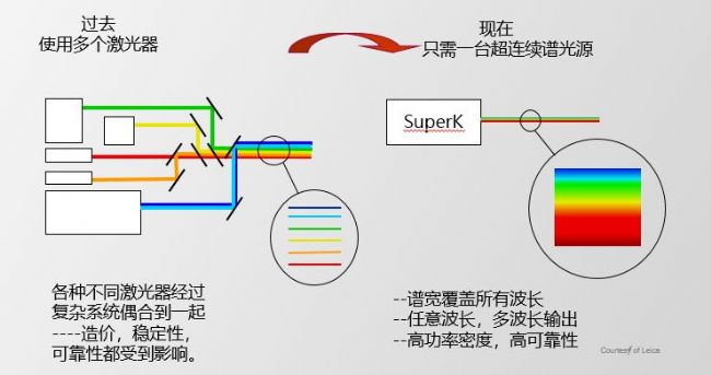 為了適應(yīng)多種觀測需求一般采用多激光系統(tǒng),需要用到多個獨立的激光器經(jīng)過復(fù)雜的系統(tǒng)耦合到一起,系統(tǒng)復(fù)雜且成本高昂。現(xiàn)在NKT公司推出的超連續(xù)譜光源完美的解決了這個問題。