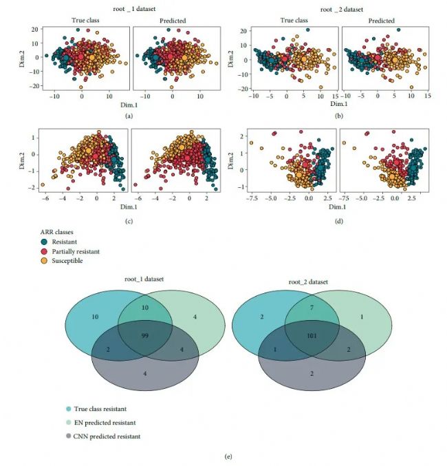 Fig.5: nMDS ordinations of test set (random run = 7): (a) RGB features selected using EN for root_1 dataset, (b) RGB features selected using EN for root_2 dataset, (c) FC features extracted from CNN for root_1 dataset, and (d) FC features extracted from CNN for root_2 dataset. (e) Venn diagram of resistant class classification averaged across the 10 random runs.