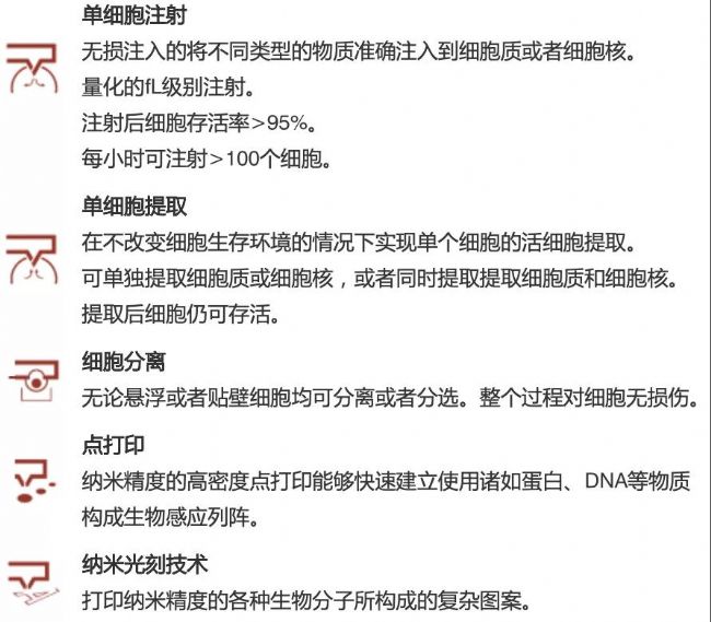 瑞士Cytosurge AG公司的多功能單細(xì)胞顯微操作系統(tǒng)FluidFM BOT,是將原子力系統(tǒng)、微流控系統(tǒng)、細(xì)胞培養(yǎng)系統(tǒng)合為一體的單細(xì)胞操作系統(tǒng),采用不同孔徑的微型納米注射器,可實(shí)現(xiàn)單細(xì)胞注射(Injection)、活細(xì)胞內(nèi)物質(zhì)提。‥xtraction)、單細(xì)胞分離(Isolation)、粘附力測(cè)定(Adhesion)、納米打印(Nano-printing)等多種功能,全程機(jī)械臂操縱,將污染風(fēng)險(xiǎn)和人為誤差降到最低,提高工作效率與實(shí)驗(yàn)可重復(fù)性,具有高度自動(dòng)化、操作速度快與操作精確度高等特點(diǎn),能夠在單細(xì)胞水平上為研究者提供極大的便利,可應(yīng)用于單細(xì)胞質(zhì)譜、單細(xì)胞力譜、單細(xì)胞基因編輯、細(xì)胞系構(gòu)建、藥物研發(fā)、精準(zhǔn)醫(yī)療等領(lǐng)域。