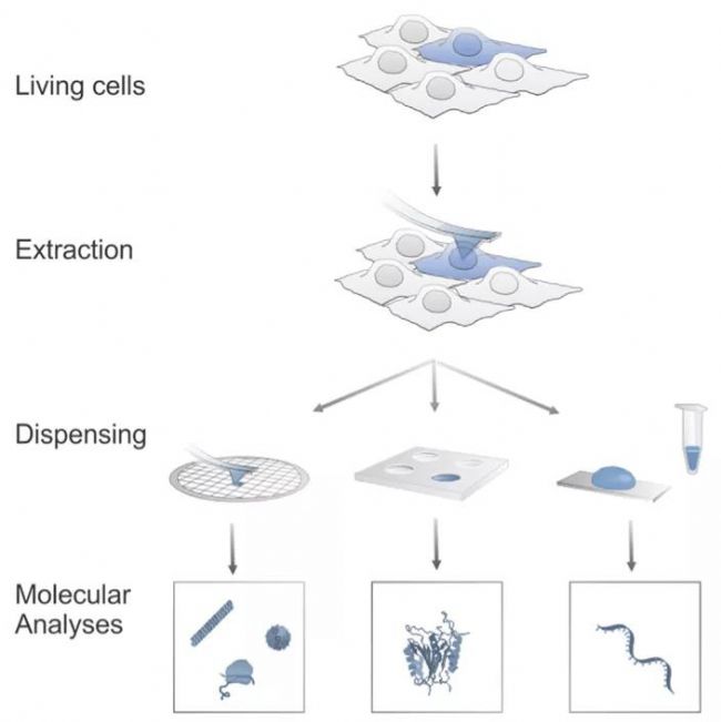 FluidFM BOT系統(tǒng)的活細(xì)胞內(nèi)物質(zhì)提取功能十分溫和,可直接用微型納米注射器吸取活細(xì)胞的細(xì)胞質(zhì)或細(xì)胞核中的物質(zhì),無需經(jīng)過化學(xué)或生物學(xué)手段進(jìn)行破膜處理,不會(huì)產(chǎn)生裂解的細(xì)胞碎片,不會(huì)對(duì)內(nèi)部細(xì)胞器造成任何破壞,可用于電鏡成像、酶活檢測(cè)、核酸表達(dá)檢測(cè)、代謝組學(xué)、基因測(cè)序等多方面研究。