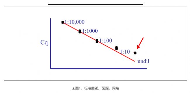 多種方法可用于評(píng)估生物樣品中是否存在抑制劑。常用方法是通過(guò)連續(xù)稀釋樣品來(lái)評(píng)估樣品的PCR效率,PCR效率的高低一定程度上反映出樣品質(zhì)量的好壞。一個(gè)高效的PCR反應(yīng)要求擴(kuò)增效率在90%-110%之間,當(dāng)擴(kuò)增效率>110%或<90%,無(wú)論是相對(duì)定量還是絕對(duì)定量其最終結(jié)果都會(huì)不準(zhǔn)確。那么怎么來(lái)判斷是由于抑制劑引起的擴(kuò)增效率異常呢?如圖1所示,通過(guò)標(biāo)準(zhǔn)曲線的狀態(tài)判斷,當(dāng)原液的數(shù)據(jù)點(diǎn)位于標(biāo)曲上方(紅色箭頭),則極有可能是樣本抑制劑抑制PCR反應(yīng)導(dǎo)致Cq值偏大。