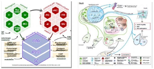 在近幾年的研究中,科研人員逐步發(fā)現(xiàn)激活皮質(zhì)生長抑制素中間神經(jīng)元,可防止神經(jīng)性疼痛發(fā)展;BLA–mPFC–PAG–脊髓通路失調(diào)、疼痛感覺與情感成分之間,存在直接因果關(guān)系;中腹丘腦核(MD),中央外側(cè)核(CL)和束旁核(PF)參與疼痛的調(diào)控研究更加明確;GABA能神經(jīng)元的γ波振蕩在痛覺和情感相關(guān)的皮層區(qū)域調(diào)節(jié)其他神經(jīng)元的活動,并通過PAG-RVM-脊髓軸調(diào)整傷害性感受強(qiáng)度。